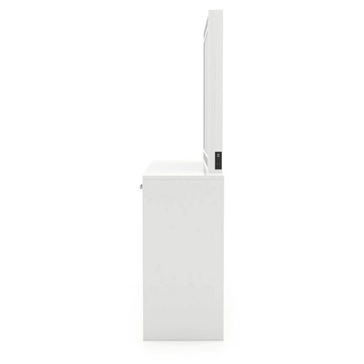 The vanity is perfect for providing storage and space in the bathroom, bedroom, or dressing area. The spacious top represents good-sized storage. With all-around LED lights for perfect lighting, pocket drawers to organize your jewelry and accessories, and a USB port. The luminous white wood finish and modern design are adaptable for any decor style. It is the perfect spot to prepare yourself for a day of work or an important date.