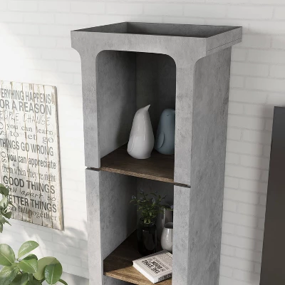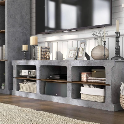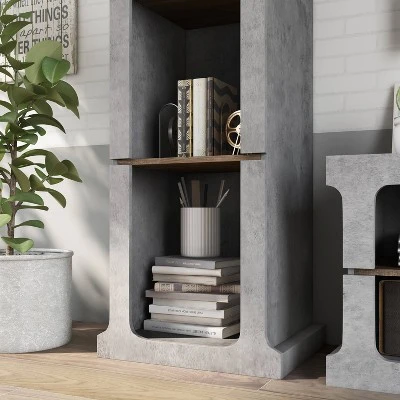 This 2-piece entertainment center makes a bold statement in your living room. The urban design features cement gray frames with wood-tone shelves. A media tower displays decor while a TV stand offers rear wire whole access for organizing consoles. Perfect for your rustic, casual, or farmhouse living room, the console boasts a low profile and six shelves for storage and display. Add decor to the upper shelves for a stylish look or fill the bookcase with media and games to keep you entertained for days.