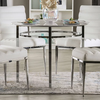Any dining room will look delightful with this round dining table, crafted from metal and serving as a focal point in the home. The table has a beautifully streamlined design and will seat up to 4 people for a meal. Enjoy every evening spent around this dinner table with family and friends, all while boasting a cool and contemporary style.