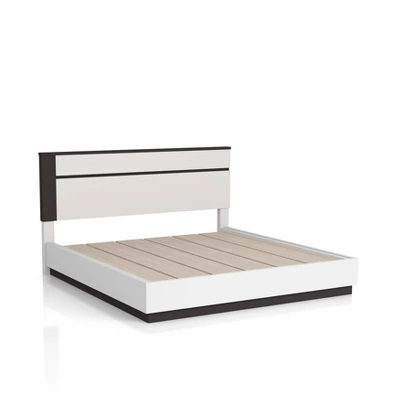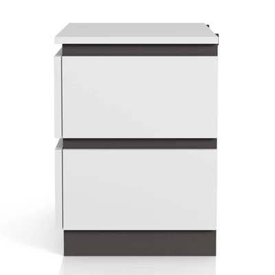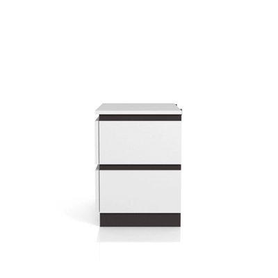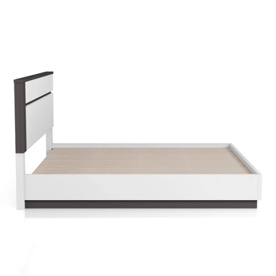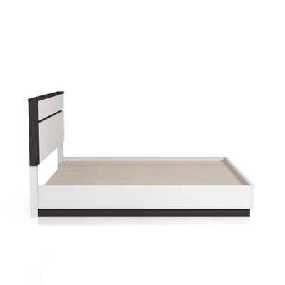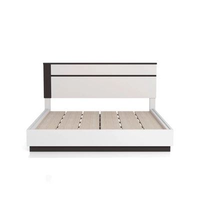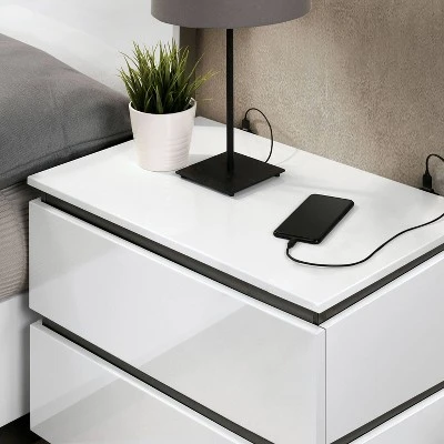 This visually striking, contemporary bedroom set boasts horizontal metallic gray lines set against crisp white panels in a lustrous high gloss finish for a bold, contrasting effect. An asymmetrical panel headboard shows off this two-tone design, creating clean lines with a hint of intrigue. Flush drawer fronts and concealed drawer pulls, along with built-in USB ports behind each nightstand, offer sleek touches and modern sensibilities. This frame is made from recycled lumber, which had its beggings on a rubber tree farm. To prevent the traditional waste of natural resources through burning, rubber trees are retired into furniture.