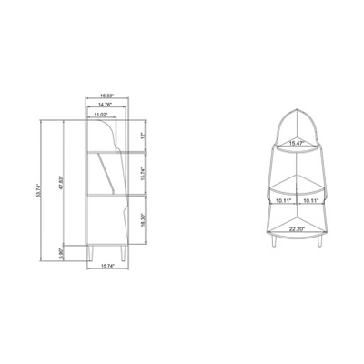 - Overall: 53.74 in. H x 16.33 in. W x 16.33 in. D; Top shelf: 12 in. H x 15.47 in. W x 11.02 in. D; Middle shelf: 15.74 in. H x 10.11 in. W x 14.76 in. D; Bottom shelf: 18.30 in. H x 22.20 in. W x 15.74 in. D