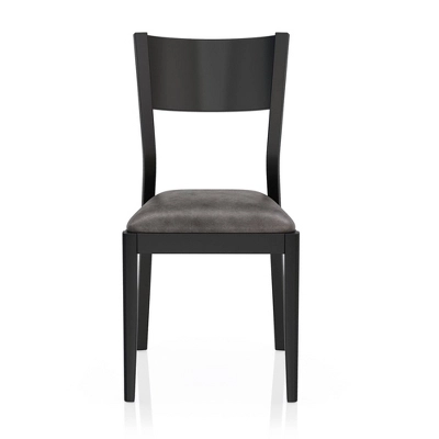 This mid-century modern dining table set features an antique oak finish and is crafted with faux leather seats and solid wood legs. The plank-style top complements the trestle base, adding a touch of warmth to the sleek black and gray design. Angled backrests provide comfortable seating for four people. Complete with a dining table and four matching chairs, this set makes a perfect option for casual dining or entertaining guests. Made from rubberwood, durable solid wood sourced from rubber plantations. After the sapwood is tapped for latex, the workable timber is harvested for furniture.