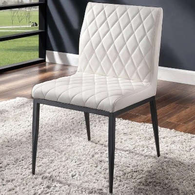 Transform the look and feel of your dining room with this modern 7-piece dining set featuring a rectangular dining table and six dining chairs. The table is crafted with a white lacquer top inset with black metal legs, while the chairs feature diamond tufted seats in white leatherette and black tapered metal legs. This eye-catching two-tone set ups the elegance and glam in any modern style home.