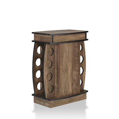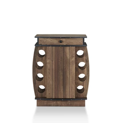 Complete your farmhouse style billiard room with a barrel inspired mini-bar. The reclaimed oak finished wine rack is adorned with nailhead trim for a rustic style. This display combines the likes of a wine barrel and a revolver with the wine bottle slots along the rounded sides. For an even more exciting feature, a stemware rack hides behind the wood panels.