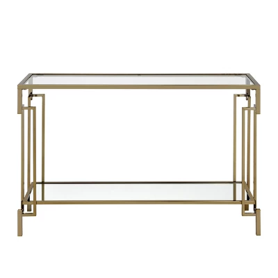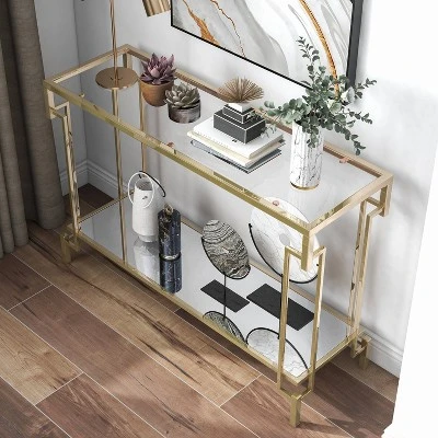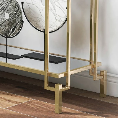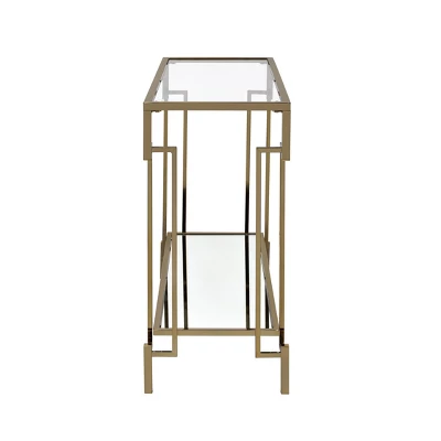 Modern regency and retro class come together on this champagne accent table. The sofa table exudes an art deco style with a geometric leg design. A combination of glass with mirror surfaces adds a glam touch. Light and airy in a champagne finish with glass tabletops, each piece is complete with a mirrored lower shelf for easy display.