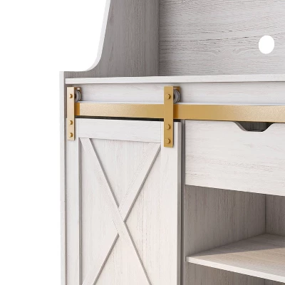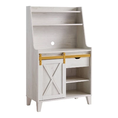 A sliding wood baker rack with shelves is a wonderfully versatile piece that can be used in any room in your home. The rustic barn-style design gives the look and feel of a modern farmhouse. The white wood oak woodgrain finish on the laminated particleboard adds to the rustic charm of this piece. It features one sliding wooden door, one drawer with metal glides four interior shelves, and two open shelves, perfect for additional kitchen appliances, pantry items, and decor.