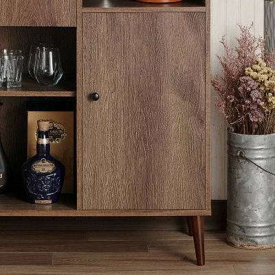 Easily organize your entire kitchen or bar with this Wine Rack. Multiple open shelves let you stylishly store and display dinnerware, glasses and spirits, while the single drawer and cabinet provide discreet storage for bar tools, pots, pans and more. Use the wine and stemware glass rack to effortlessly entertain and elevate your look with decor thanks to the variety of open shelves. Crafted of Wood and resting atop turned legs, the Elmora Wine Cabinet in distressed walnut updates your kitchen or bar to charming and timeless mid-century style.