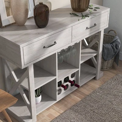 Keep your wine stored in an organized way with this white wood wine bar. A built in wine rack lets you store up to 6 standard bottles of your favorite wines, 4 open space shelves are great for showing off display plates or mugs, decor, bar accessories, and handles of your preferred spirits, while 2-drawers for storing silverware or smaller bar accessories. The center upper console features easy to reach 3 stemware racks that can hold up to 9 stemwares. Dark metal pulls allow easy access to the drawer.