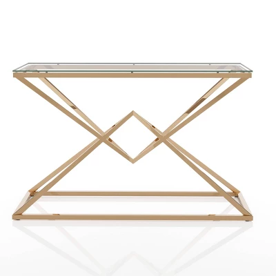 Friends and family are sure to be enraptured with the bold, sculptural design of this modern glass console table. It features a dramatic open base crafted in steel with a pair of open, intersecting pyramid frames that meet at their apexes to create an intriguing diamond center. The tabletop is glass, allowing the base to take center stage in an elegant entry or living room.