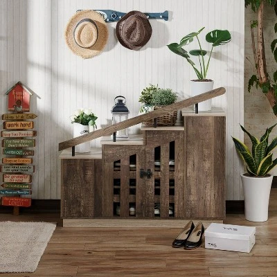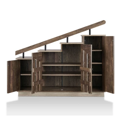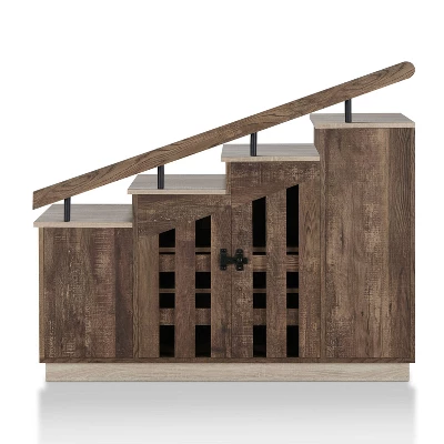 Add this novelty-style, reclaimed oak staircase shoe cabinet to your home and instantly start conversations. The cabinet doors open up to shelves for shoes, while the top is fashioned to resemble a staircase with handrail – all in an oak finish with contrasting accents and details. This piece is crafted width quality of wood and metal.