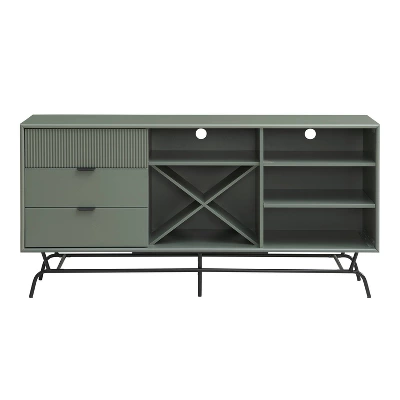 We would like to introduce the Sage Green TV console, an exquisite piece of furniture that will add a touch of elegance to your living or family room. This TV console is designed to provide you with versatile storage options for your TV, components, and media. It features three spacious drawers and four shelves, which offer ample space to store your belongings. Additionally, it comes with a removable wine bottle rack, which is perfect for wine enthusiasts.
