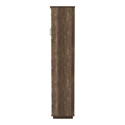 Add the rustic style to your kitchen or dining room with this farmhouse-style wine cabinet. Crafted with durable manufactured wood in a reclaimed oak finish accented with black hardware, metal mesh, and an accent frame, this versatile piece features bottom-shelf storage an additional display, and one drawer for bar utensils. In addition, the built-in wine rack can showcase your 12 standard wine bottles. A single door in the top opens up to reveal two more compartments where you can keep your spare barware, liquors, or mixers. This vertical wine cabinet has melding classic beauty and urban styles, also perfect as an accent piece to add depth to your living area.