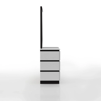 This visually striking, contemporary six-drawer dresser and mirror pair boast horizontal metallic gray lines set against crisp white panels in a lustrous high gloss finish for a bold, contrasting effect. A symmetrical frame shows off this two-tone design, creating clean lines with a hint of intrigue. A tiered base mimics the duality, pushing the flush and sleek ultra-modern drawers of this daring furniture piece. This frame is made from recycled lumber, which had its beggings on a rubber tree farm. To prevent the traditional waste of natural resources through burning, rubber trees are retired into furniture.