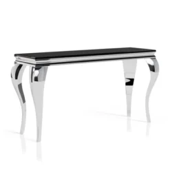 Taking artistry to a whole new level, this impressive contemporary console table draws all eyes in any room. It features a crisp metallic finish with a black tempered glass top that combine to create bold contrast. The showstopper for this exquisite table is its artful base, featuring myriad radiant rods that create a spiral effect certain to impress friends and family alike.